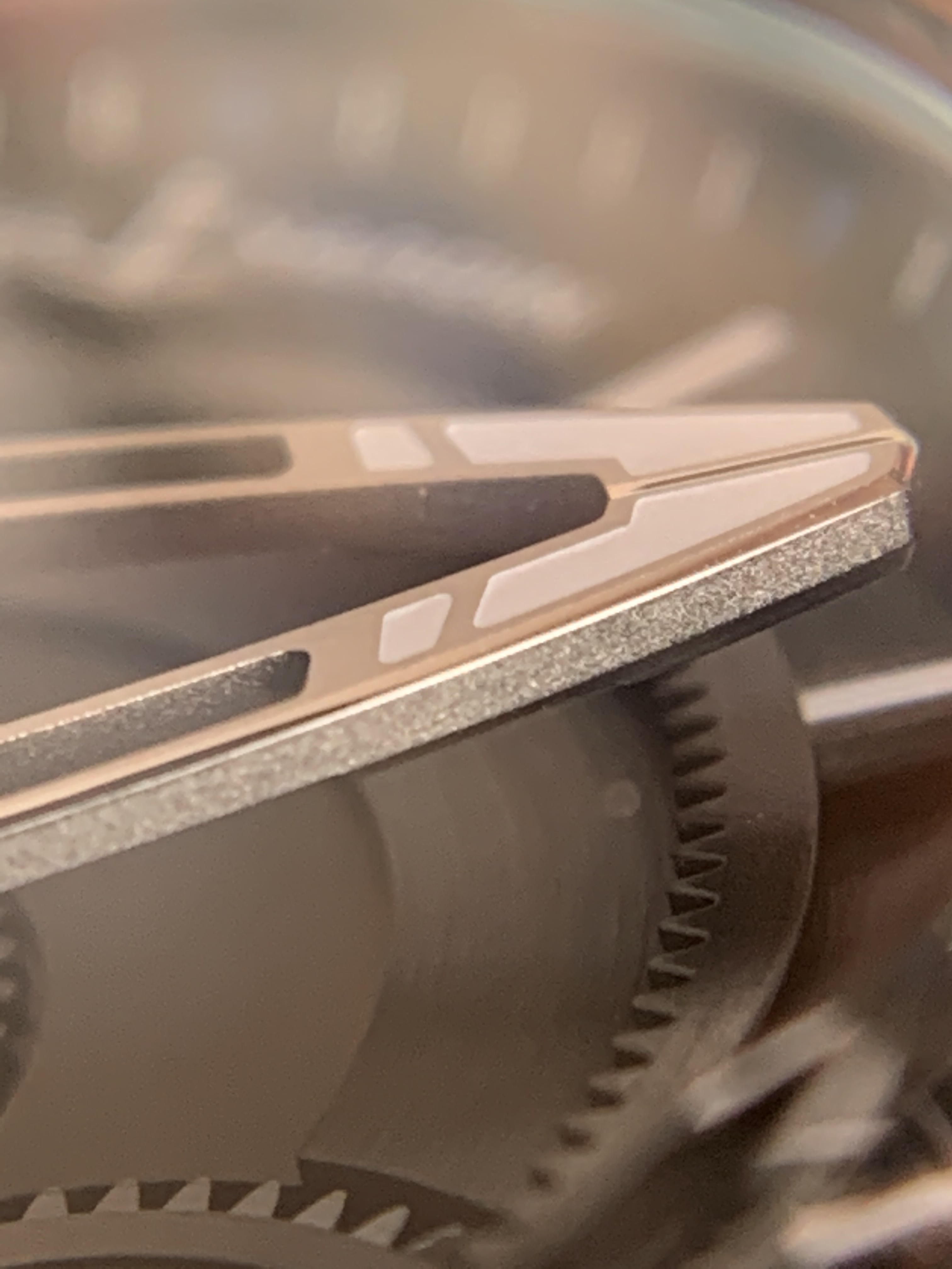 また脱進機にはダイヤモンシル(ダイヤモンドコーティングされたシリシウム)が使用されており、テンワには安定化のためにニッケル製エレメントとマイクロブレードが搭載されており、めちゃかっこいいんです。(画像参照ください)