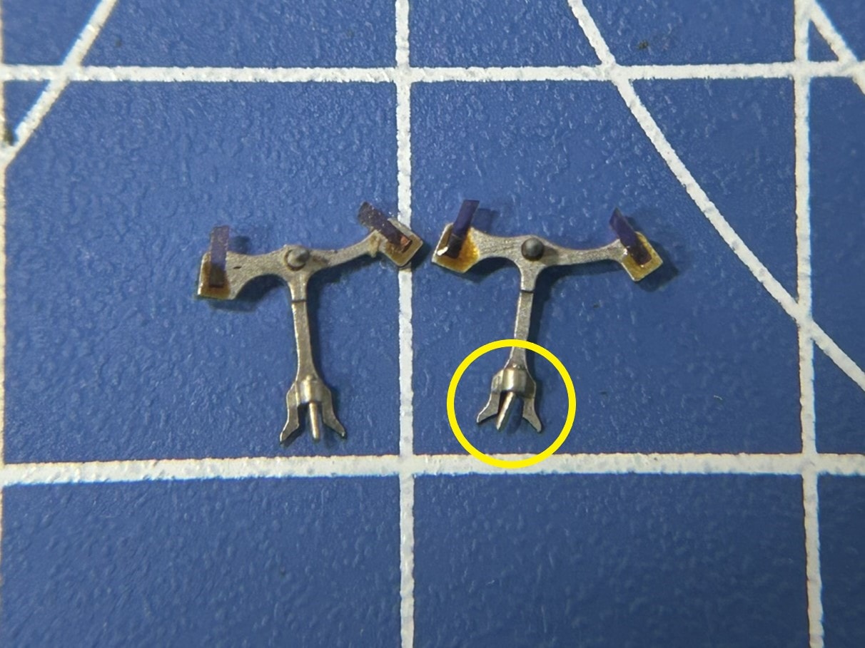 写真の通りアンクルの剣先がひん曲がっている状態です。最初はパーツ交換しない方針でやれないかと思い、曲げの矯正を試みましたが、こんな髪の毛のような部分でも思ったより硬く、アンクルの軸ごとひん曲がってしまいそうだったので断念。諦めて交換となりました。実はこれもハズレ個体であることが後に発覚し後で更に交換するハメになるのですが…(後述)