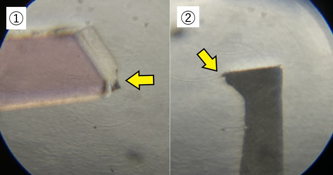 1~4番車は特に問題は無いようでした。が、しかし、先程交換したアンクルを見たところ、爪石の先端が欠けておりました(写真3-①)。更にガンギ車を見てみたところ、歯車の先端が削れてバリのようなものができておりました(写真3-②)。