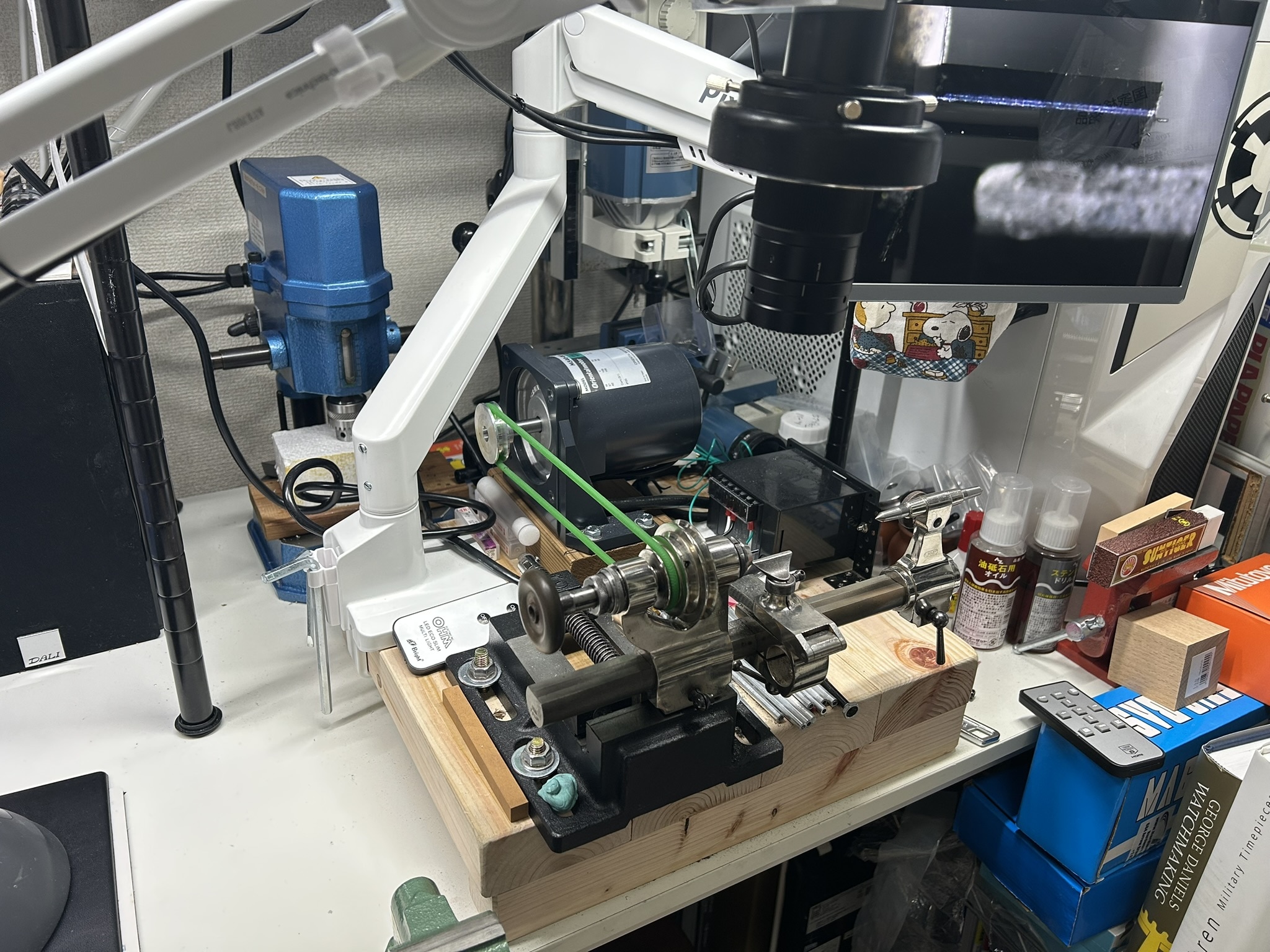 ガンプラと違い、時計用旋盤は当然ながら旋盤だけでは完結せず、旋盤以外にもベースからモーターまで自分で用意する必要があります。ある意味ミニ四駆みたいですね(笑)