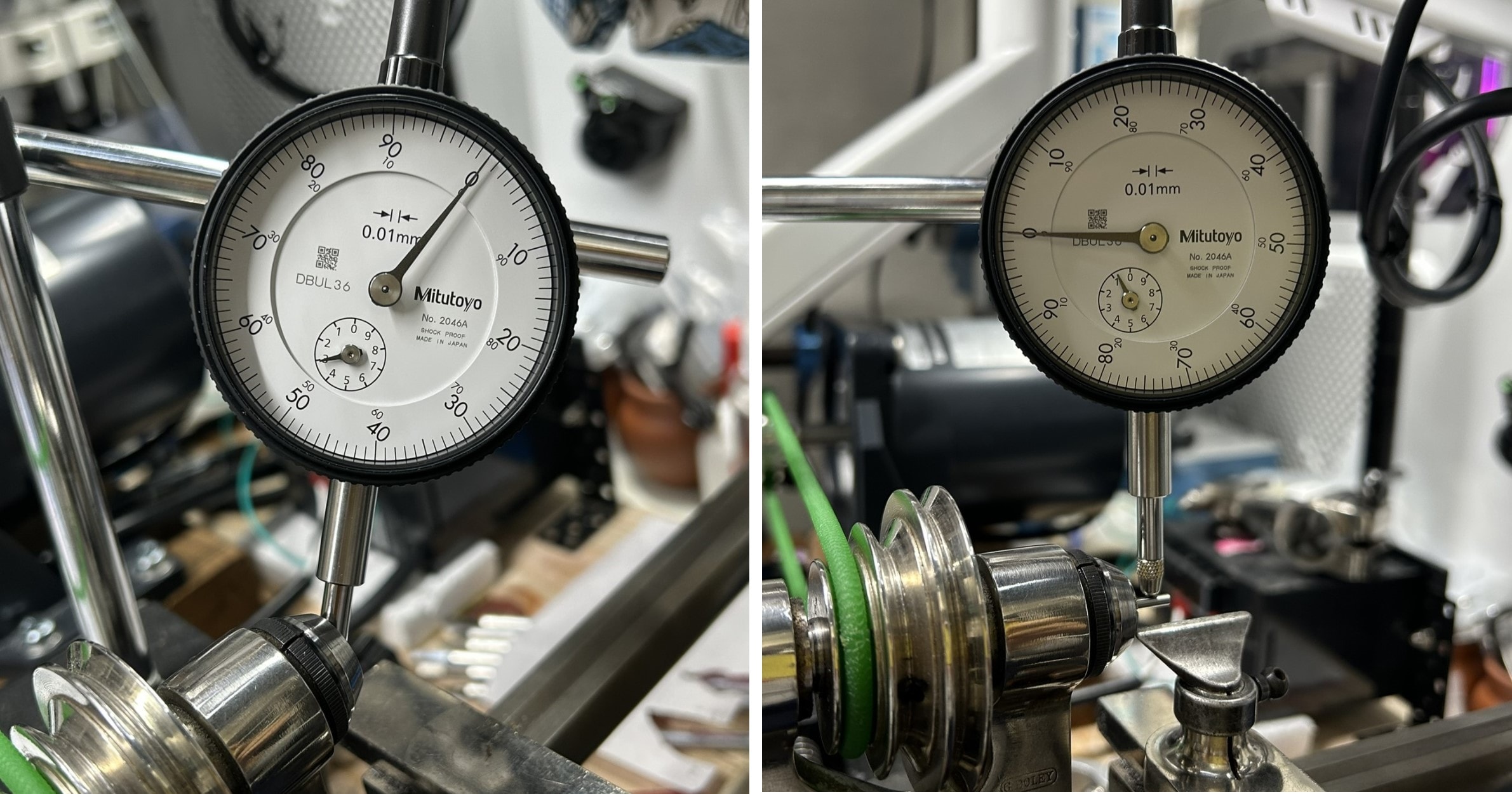 手持ちのマグネットスタンドとダイヤルゲージを用いて、チャック挿し込み部分の軸ブレ、チャックに3mm棒を噛ませてワークの軸ブレの測定を行ったところ、どちらも約1~2μmでした(写真3)。