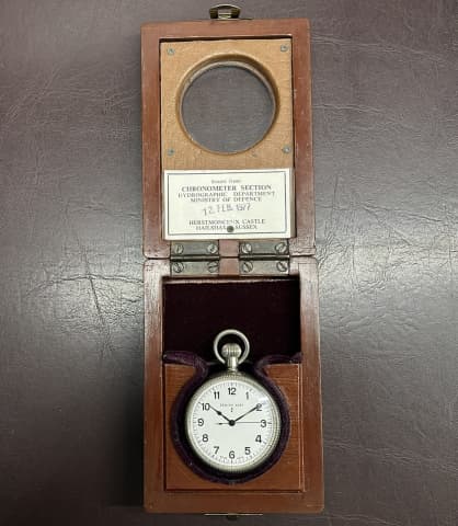 つまり本個体の刻印は「H.S.↑3」であることから、「英国海軍に所属していたデッキウォッチ」であることがわかります。そのまんまですね(笑)。上でご説明いたしました管理体系のもと、グリニッジ王立天文台で試験された後、英国海軍水路部によって運用されてきました。