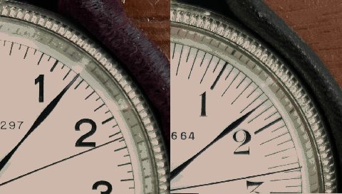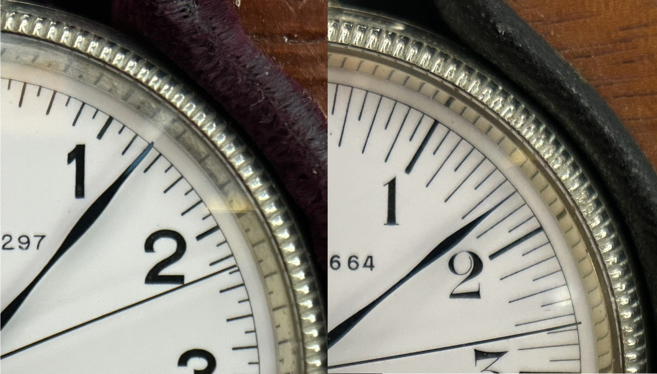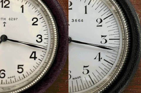 …前期型を散々こき下ろしましたが、この段階ではまだ、両者致命的なほどに差があるというほどでもありませんでした(前期型だって1971年まで現役だったわけですものね)。しかし、分針と秒針がニアミスする時刻の読み取り(写真3)。ここで前後期の明暗がハッキリ別れたという感じです。