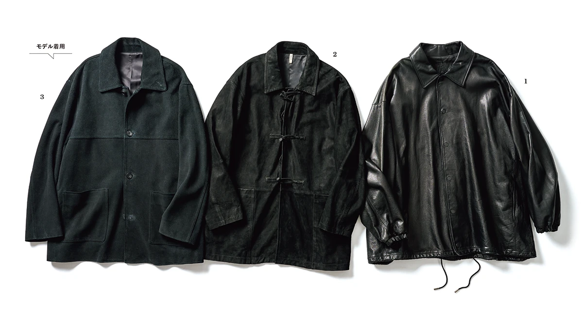 エー レザーは、日本国産原皮を姫路のタンナーが鞣した柔らかな質感が特徴のカウレザーを用いて、コーチジャケットのデザインを採用。ゆったりしたシルエットで、自然なドレープが生まれる。裏地には吸汗放湿性を備えたレーヨンコットンを使って着心地にも配慮が行き届く(写真1)。シーシーユーの逸品は、英国のGPO(=一般郵便局)で使用されていたダッフルコートを基に、フレンチワークの要素を重ねたデザインが個性的だ。シボの少ないパキスタンカウレザーのしっとりした手触りを活かし、洗練された表情へと仕上げたモデルだ(写真2)。シュタインはカウスエードを0.8mm厚に削り、柔らかな風合いを引き出した。ヴィンテージのカージャケットをベースに再編集したもので、漆黒のスエードが、モードな雰囲気を漂わせる(写真3)。