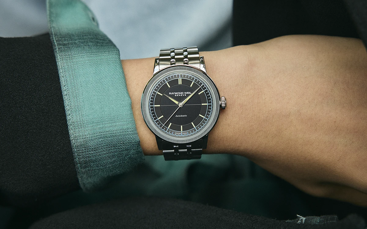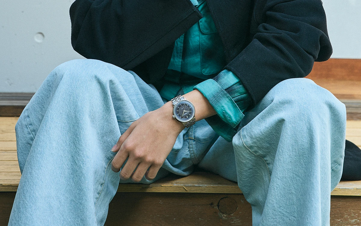 アンスラサイトのセクターダイアルが印象的なレイモンド ウェイルの「ミレジム センターセコンド」。縦の筋目を刻んだ中央部からアワートラックへと段差を付け、外周のミニッツトラックは緩やかに傾斜するなど、細やかな変化を与えた立体的なデザインが特徴だ。ブラックのカウスエードで仕立てたカージャケットに、鮮やかなシャツ&デニムという軽快な要素を重ねても、アンスラサイトの落ち着いた表情やSS製ブレスレットが手元で控えめに存在感を示す。