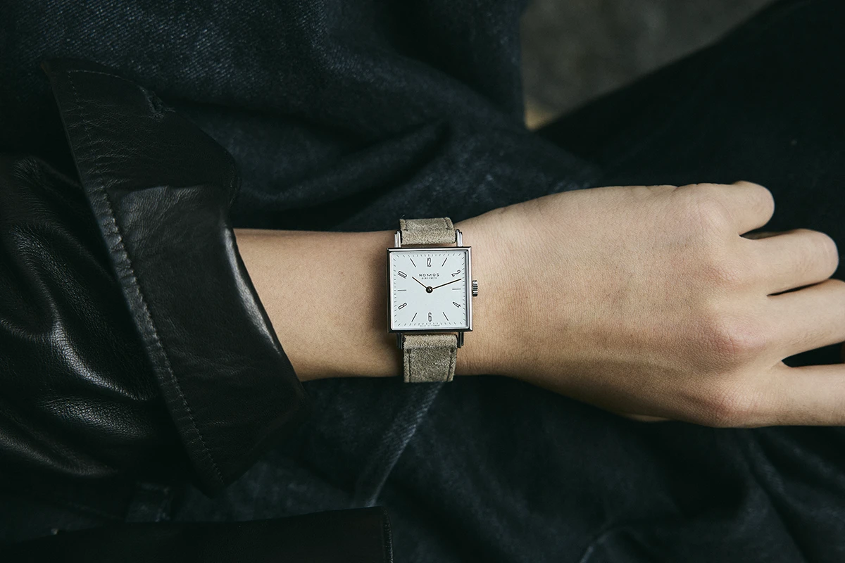 直線が描く緊張と余白の静けさをまとったノモス グラスヒュッテ「テトラ 27 デュオ」。白銀仕上げのスクエア文字盤に時分針のみを置いた簡潔な表情は、時間を研ぎ澄ますように構成されている。そんな角型ケースの腕時計に組み合わせたのはミニマルでモードな雰囲気が漂う革ジャンだ。