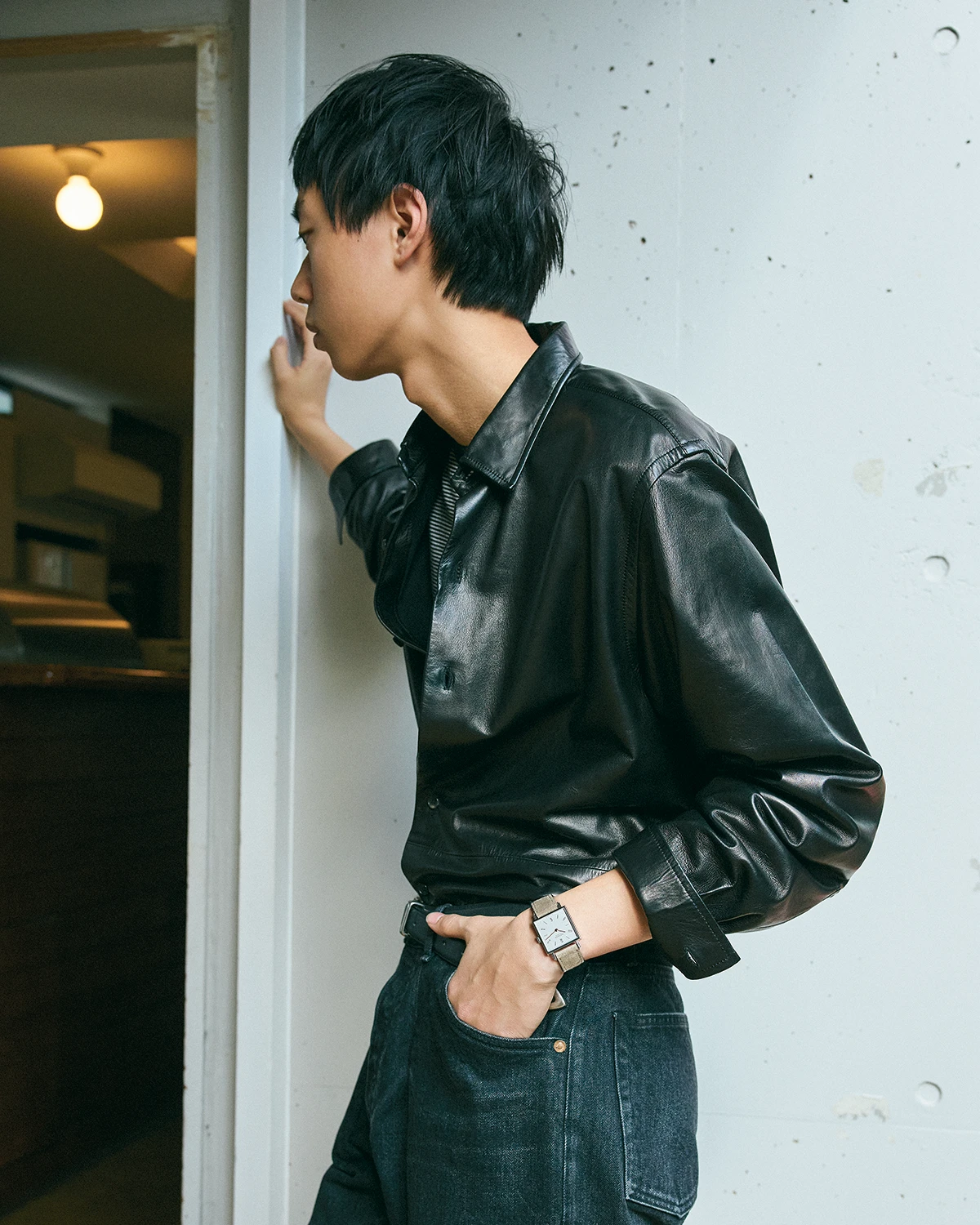 角型ケースの直線が軽やかに映えるノモス グラスヒュッテの「テトラ 27 デュオ」。バウハウスの思想を背景に、簡潔に構成された2針の端正な表情がスクエアケースに静かな美しさを与えている。スペイン産ラムレザーを採用し、極薄に仕上げたシャツはしなやかな落ち感と、オフィサーシャツ由来の無骨な印象が共存した1着だ。レザーの艶とスクエアフォルムが互いに響き合い、全身をブラックのワントーンでまとめた装いにモードな洗練とさりげない個性をもたらす。