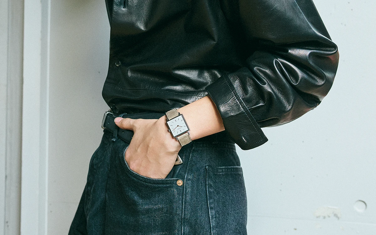 ミニマルかつモードな革ジャンを合わせると、角型時計の存在感がより確かな輪郭を帯びる。削ぎ落とされたデザインが重なることで、腕時計の魅力が際立つのだ。