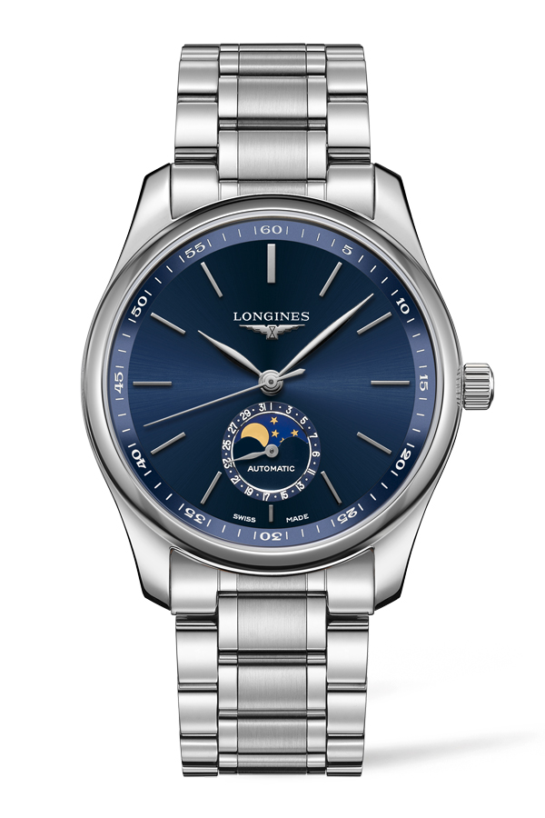 サンレイ仕上げのブルーダイアルに、指針式のデイトサークルを持つムーンフェイズ表示を組み合わせた新作。ケースバックからは高い技術力を誇るムーブメントの見事な駆動が観賞可能。アプライドインデックスやリーフ針といったクラシックな要素がエレガントさを引き立てる。装着感を高めるステンレススティールブレスレットを採用。